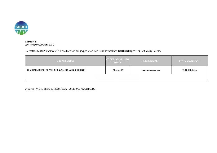 IM LIEFERANTENVERZEICHNIS DER SNAM-GRUPPE FÜR TROCKENTRANSFORMATOREN (LUFT UND HARZ)